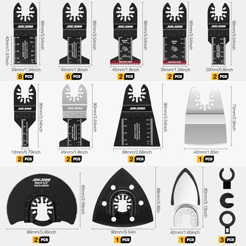 Duurzame Materialen: De multitool-zaagbladen zijn gemaakt van duurzaam bimetalen staal met een hoog koolstofgehalte en een titaniumlegering. Ze bevatten verschillende soorten zaagbladen, schuurpads en schuurpapier voor eenvoudig schuurwerk, waarmee u aan verschillende werkvereisten kunt voldoen voor nauwkeurig zagen en efficiënt polijsten van oppervlakken.