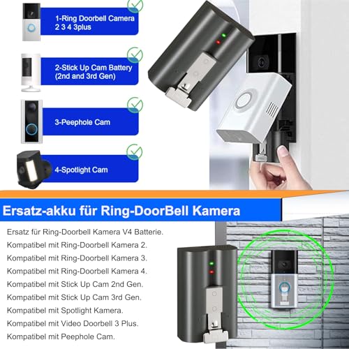【Volledig compatibele accu voor Ring】Deze accu is volledig compatibel met Ring-deurbelcamera 2, Ring-deurbelcamera 3, Ring-deurbelcamera 4, Stick Up Cam 2e generatie, Stick Up Cam 3e generatie, Spotlight Virtual digicam, Video Doorbell 3 Plus, Peephole Cam.