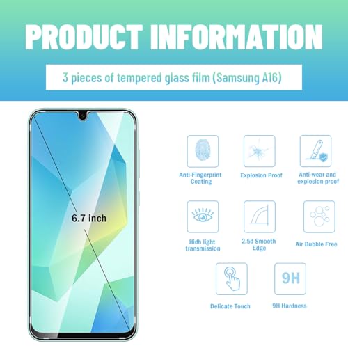 Specificaties: 3 stuks gehard glas voor Samsung Galaxy A16 4G/5G, displaybeschermfolie, krasbestendig, anti-vingerafdruk, luchtbelvrij, hardheid 9H, ultrahelder, zeer robuust
