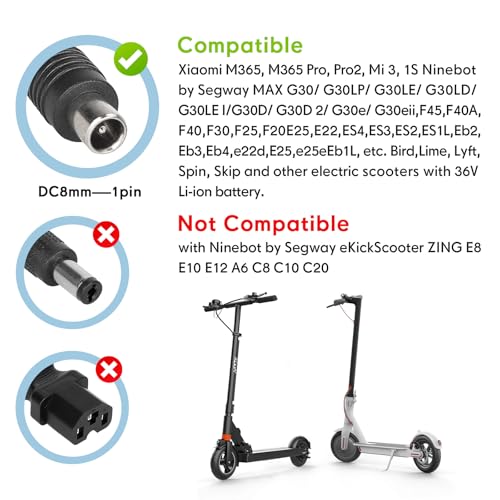 【Brede compatibiliteit】42V 2A Universele Lithium Acculader Adapter 8mm Plug voor Xiaomi M365, Pro, Pro2, mi 3, 1S, Ninebot ES1, ES2, ES4, ES3, E22E, E25E, E45E, ES1L, ES2, ES3, ES4, F20, F25, F30, F40, MAX G30, GLE30LP, G300LP, G300, G30LD, G30LE II, G30D, G30D 2, G30e, G30e II, NovaMile N20, G30, AOVO PRO M365, ES60, ES80, USIE T1, Smartgyro Xtreme City en andere elektrische scooters. Controleer bij het kopen van deze oplader of de connector van je apparaat compatibel is met de grootte van de stekker.