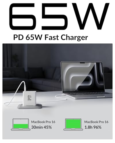 65 W Mac Book Oplader: Het totale uitgangsvermogen is 65 W en is uitgerust met 4 uitgangspoorten, waaronder USB C1-poort (65 W), USB C2-poort (20W) en USB-A poort (20W). Het duurt slechts 1 uur en 45 minuten om een MacBook Pro 14 inch volledig op te laden en biedt voldoende stroom voor je smartphones, tablets en laptops.