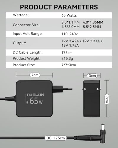 Productspecificaties – 65W Asus Laptop Charger Output: 65W 19V 3,42A (ook compatibel met 45W & 33W) Input: 100 – 240V Interface grootte: 3,0 * 1,1mm / 4,0 * 1,35mm / 4,5 * 3,0mm / 5,5 * 2,5mm