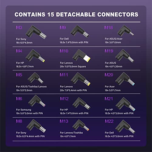 ✨【Specificaties】Input: 100-240V 50-60Hz; Uitgang: 16V/ 18.5V/ 19V/ 19.5V/ 20V, 4.. 74A, 90W Maximum (compatibel met 65W/45W/33W); 15 Schakelaarstypes: 6.5*4.5mm/ 4.8*1.7mm/ 5.5*2.5mm/ 5.0*3.0mm met speld/ 6.5*4.4mm met speld/ 7.4*5. 0 met pin/ 1.1*5.0mm(retangular tip)/ 7.9*5.4mm met pin/ 7.4*5.0mm met pin/ 4.0*1.7mm/ 3.0*1.0mm/ 4.0*1.35mm/ 5.5*1.7mm/ 4.5*3.0 met pin*2; Totale draagbare voedingskabel: 2.7M (Opmerking: Geen USB C connector!!!)