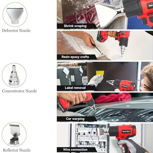 Breed scala aan toepassingen: met 3 verwisselbare sproeiers kunnen handheteluchtpistolen in verschillende scenario’s worden gebruikt. Ideaal voor doe-het-zelvers en pros. Veel gebruikt voor het verwijderen van verf, het verzachten van waterleidingen, krimpen, vinylcoating, epoxyhars, het ontdooien van bevroren buizen, het buigen van kunststof- of krimpslangen, foliebekleding van automobile’s, enz.