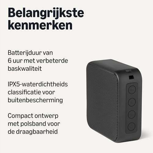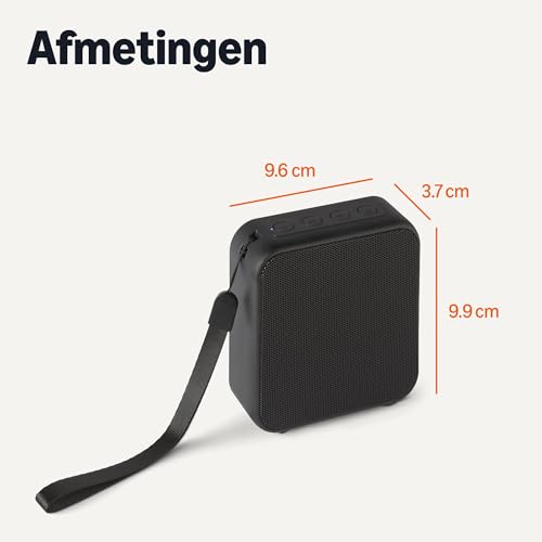 Specificaties: Amazon Basics Draadloze Bluetooth-luidspreker, 6 uur speeltijd, IPX5-waterdicht, voor thuis, buiten, 9.4 cm × 9.6 cm × 3.4 cm, Zwart