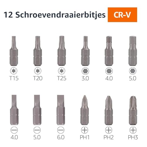 12-in-1 magnetische ratelschroevendraaier, bevat 1 schroevendraaierhandgreep en 12 stuks schroefbits die in de handgreep bewaard worden om ze gemakkelijk mee te nemen: SL4, SL5, SL6, PH1, PH2, PH3, T15, T20, T25, H3, H4, H5. Hij is handig voor het aan- en losdraaien van schroeven; ideaal voor het werken aan populaire elektrische apparaten zoals airconditioners, wasmachines, koelkasten, televisies en dergelijke.
