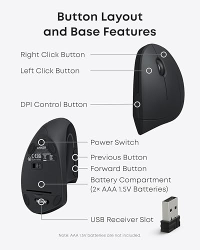 Anker 2.4G Wireless Verticale Ergonomische Optische Muis Verticale Ergonomische Optical Muis Draadloos voor Windows en Mac OS, USB, 800/1200/1600 DPI, 5 toetsen