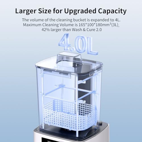 Gemakkelijk te reinigen: vergeleken met Wash&Cure 2.0 is de waskorf met 42% uitgebreid tot 3 liter, en het totale volume van de wastank is 4 liter, geschikt voor LCD 3D printers tot 7,3 inch. Wasformaat: 165 x 100 x 180 mm, uithardingsformaat: 160 x 180 mm (① korfreiniging: 165 x 100 x 180 mm ② hangende reiniging: 160 x 100 x 165 mm).