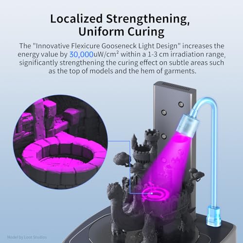 Duurzaam: dankzij de nieuwe opstelling van de lampkogels in combinatie met de lenslichtbron is de uitharding van het hele model completer en uitgebreider dan bij de vorige generatie Wash&Cure 2.0. ② Het innovatieve ontwerp van de Flexicure zwanenhalslamp verhoogt de energiewaarde met 30.000 uW/cm² in het bestralingsgebied van 1 tot 3 cm, wat het uithardingseffect op de bovenkant en kleinere delen van het model aanzienlijk verbetert.