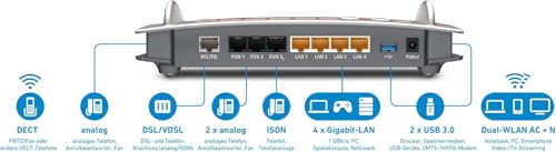 Twin WLAN AC+N router met 1.300 (five GHz) + 450 Mbit/s (2,4 GHz) voor gelijktijdig gebruik van beide WLAN-frequenties, VDSL- en ADSL-/ADSL2 +-modem (Annex B voor Duitsland), ondersteunt WLAN-neth. Wifi-autokanaal: geautomatiseerd zoeken naar een storingsvrij draadloos draadloos kanaal, telefooninstallatie voor internet en vaste lijn met voice-to-mail en fax-to-mail, geïntegreerd DECT-basisstation voor maximaal 6 draadloze telefoons, aansluitingen voor analoge en ISDN-telefoons, mediaserver (UPnP AV) verdeelt motion pictures, foto’s en muziek in het thuisnetwerk aan geschikte ontvangers, zoals capsules, tv’s, hifi. Bijvoorbeeld 4 x Gigabit LAN voor het aansluiten van laptop programs en gameconsoles, 2 x USB 3.zero/2.zero-poorten voor printers en opslag in het netwerk