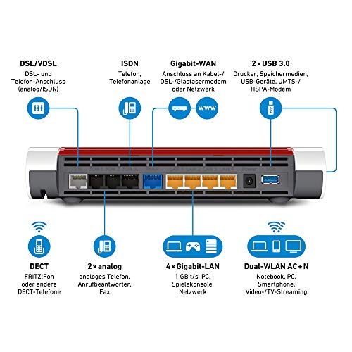 Plaats de eerste recensie voor “AVM FRITZ!Box 7590 High-End WLAN AC + N router (VDSL-/ADSL, 4×4 MU-MIMO met 1.733 (5 GHz) en 800 MBit/s (2,4 GHz), DECT-basis, Media Server) (gereviseerd)”