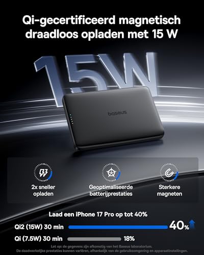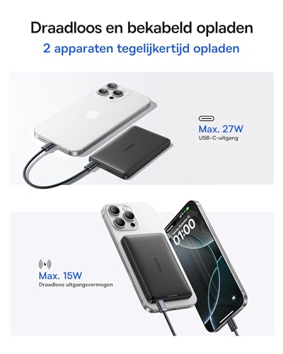 Qi2-gecertificeerde 15 W magnetisch draadloos en 27 W bekabelde snellading: ontwikkeld met de modernste Qi2 MagSafe-technologie, hecht de powerbank betrouwbaar magnetisch aan compatibele apparaten – very good voor snel, draadloos opladen onderweg. Geniet van bliksemsnelle laadsnelheden: laad je iPhone 16 Skilled binnen slechts 30 minuten op tot 50% (draadloos met 15 W MagSafe) of bereik forty nine% bij de iPhone 16 Skilled Max in slechts 30 minuten via de krachtige 27 W USB-C-aansluiting.