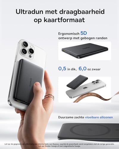 Ultraslanke, draagbare 10.000 mAh MagSafe-powerbank: deze extreem dunne powerbank (slechts 12,7 mm dikte en 170 g gewicht) past comfortabel in elke tas en is nauwelijks groter dan een creditcard. Ondanks zijn compacte formaat biedt hij een capaciteit van 10.000 mAh – voldoende om je iPhone 16 tot 1,7 keer volledig op te laden. Een onmisbare metgezel voor reizigers, pendelaars of iedereen die de hele dag mobiel wil blijven, zonder onnodig veel ruimte in beslag te nemen
