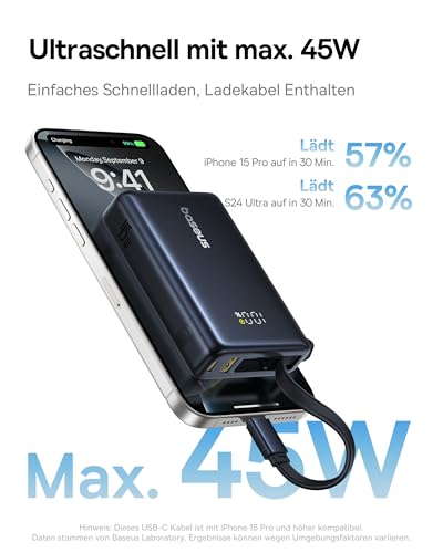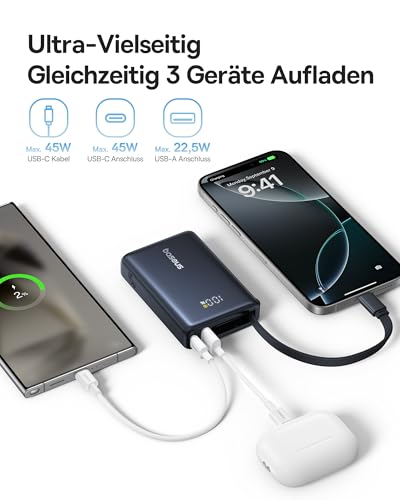 ✅45W Zwei-Wege-Schnellladung: Maximaal laadvermogen 45w. Verhoog uw iPhone 16 Pro naar 55% in 30 minuten en laad de Samsung Galaxy S24 Ultra 63% op voor echt efficiënt opladen. De USB-C-kabel of USB-C-poort laadt uw apparaat snel op bij 45 W en de powerbank bij 30 W.
