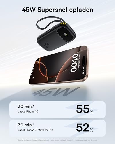 ✅【45 W bidirectioneel snel opladen】: de Baseus Qpow3 45 W 20000 mAh powerbank ondersteunt PD3.0/PPS 45W QC4+/QC3.0/QC2.0-protocollen voor extreem snel opladen. De powerbank van 20.000 mAh USB-A-aansluiting ondersteunt protocollen zoals SCP/AFC. Met de snellaadfunctie laad je je iPhone 16 Pro Max in slechts 30 minuten tot 55% op en je Samsung Galaxy S24 Ultra ook tot 55%, wat efficiënt opladen mogelijk maakt. Gebruik een USB-C-kabel of de USB-C-aansluiting met de USB-C powerbank om je apparaten met 45 W snel op te laden en de powerbank met 30 W op te laden.