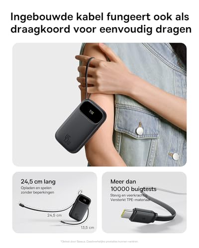 Specificaties: Baseus QPow3 Powerbank 45W 20000mAh met 2 geïntegreerde USB-C-kabels, Power Bank PD3.0 QC4.0, 3 C en 1 A, externe mobiele telefoonaccu’s voor iPhone 16/15/14 Pro Max, iPad, Galaxy, Zwart