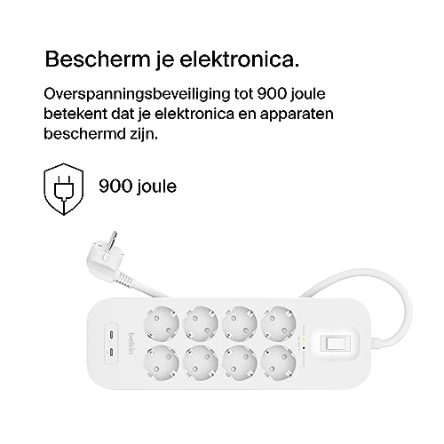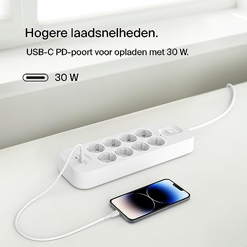Belkin spanningsbeveiliger met 8 stopcontacten, op de muur monteerbare stekkerdoos, voedingskabel van 2 m, groen indicatielampje – 2 USB-C-poorten, snelladen met USB-C PD – beveiliging tot 900 joule