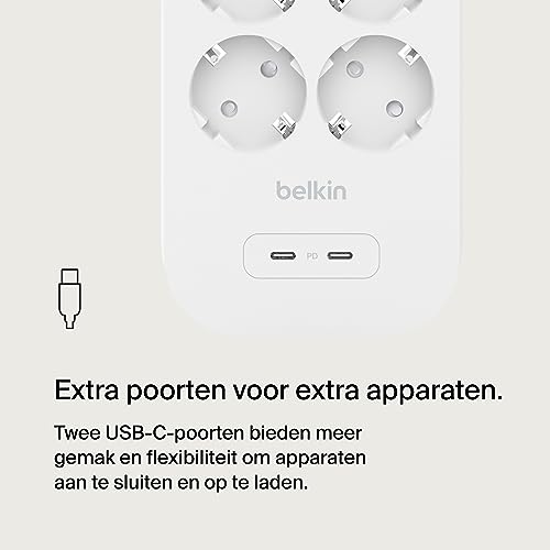 Specificaties: Belkin spanningsbeveiliger met 8 stopcontacten, op de muur monteerbare stekkerdoos, voedingskabel van 2 m, groen indicatielampje – 2 USB-C-poorten, snelladen met USB-C PD – beveiliging tot 900 joule