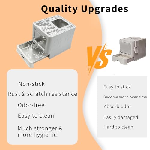 【Hygiënische roestvrijstalen bak】- Onze roestvrijstalen kattenbak met deksel en gladde binnenwand neemt geen geuren op, er kleeft niets aan, is krasbestendig en duurzaam – duidelijk robuuster en gemakkelijk schoon te maken dan conventionele plastic kattenbak