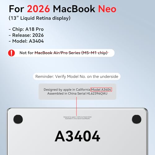 Perfecte pasvorm en compatibiliteit: Exclusief ontworpen voor de MacBook Neo thirteen-inch met A18 Skilled-chip (mannequin A3404, uitgebracht in 2026). Voorzien van nauwkeurige uitsparingen voor optimale functionaliteit. Let op! Niet compatibel met MacBook Air/Skilled-laptops met M/Intel-chips. Ultradun en vederlicht. Elegante matte en doorschijnende afwerking. Duurzame bescherming voor dagelijks gebruik. Verpakt in een aantrekkelijke geschenkverpakking.