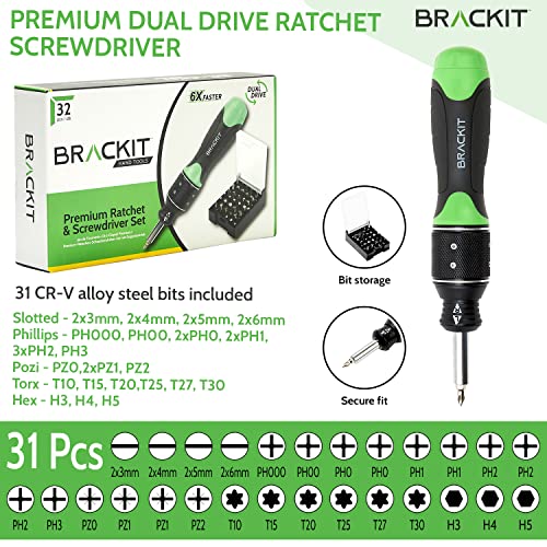 Brackit Premium 2-in-1 ratel en schroevendraaier met bits, 32-delige set, dubbele aandrijving, 6 x sneller dan gewone, handig en efficiënt voor doe-het-zelf- en installatietaken