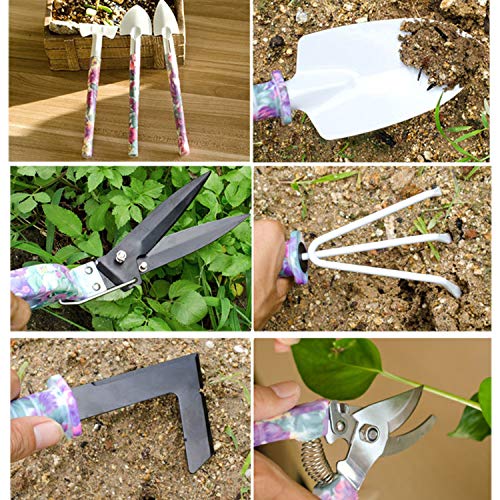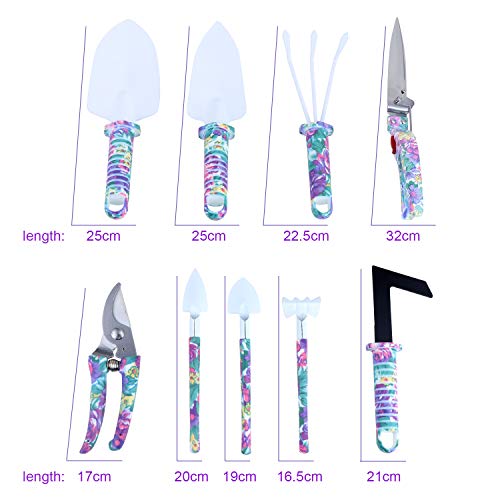 Coolty Set tuingereedschap, 10 stuks, met paarse bloemenprint, ergonomische handgreep, schop, spade, harkje, schepje, snoeischaar, plantenspuit, met draagtas, tuingeschenken