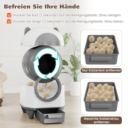 Handenvrije reiniging: de zelfreinigende kattenbak maakt een moeiteloze verwijdering mogelijk door alleen de kattenbakvervuiling te verwijderen of volledig de hele kattenbakvulling te reinigen. Een vertragingsfunctie voorkomt voortijdige reiniging. Compatibel met de meeste klonterstrooisel zoals bentoniet, mineraal en mengstrooisel, niet geschikt voor tofu of kristalstrooisel.