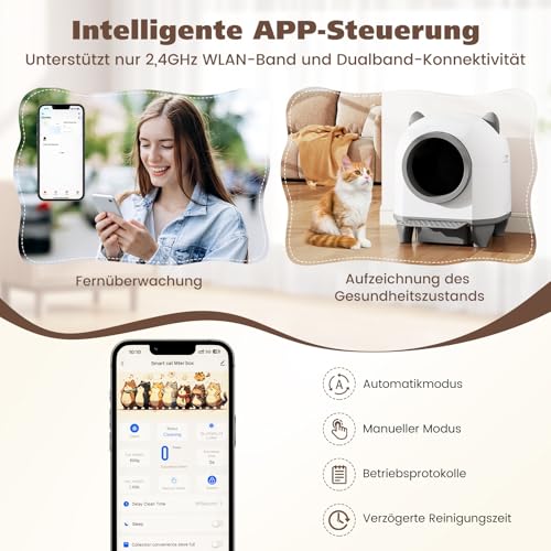 【Interactieve besturing via app & realtime-bewaking】 Met de speciale app kunt u de kattenbak op afstand bewaken en de gezondheidsstatus van uw katten bijhouden. Ondersteunt automatische en handmatige modi. Alleen compatibel met 2,4 GHz wifi en twin-bandverbinding, geeft je volledige controle en veiligheid altijd en overal.