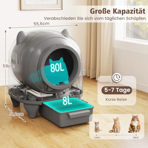 Specificaties: COSTWAY Zelfreinigend kattentoilet, 80 liter, zelfreinigend kattenbak, met app-bediening, geurcontrole en 10 sensorbeveiliging, incl. vuilniszakken, aromatherapie-box, automatisch voor meerdere katten