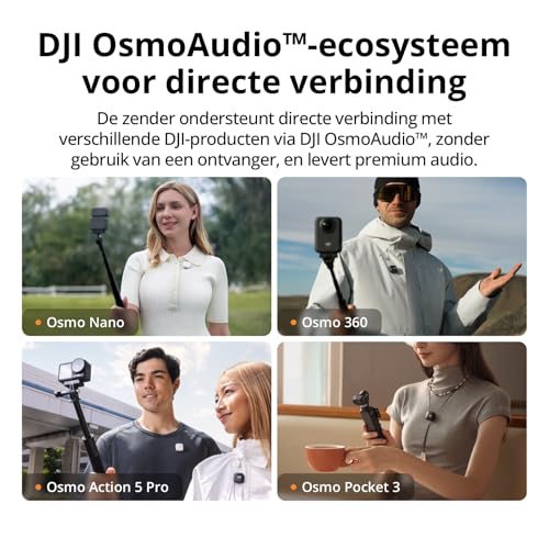 Directe verbinding met het DJI-ecosysteem – Met DJI OsmoAudio kan een zender zonder ontvanger verbinding maken met Osmo Nano, Osmo 360, Osmo Mobile 7P, Osmo Action 5 Pro, Osmo Action 4 of Osmo Pocket 3 voor hoogwaardige audio.