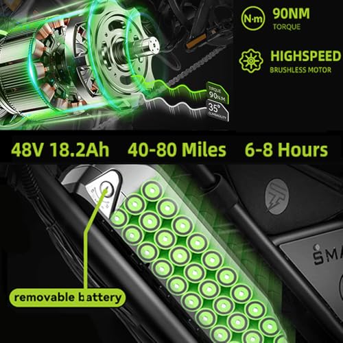 De accu heeft een lange levensduur en is uitgerust met een afneembare eenheid van 48 V en 18,2 Ah. Een enkele lading zorgt voor ca. 50 kilometer in pure elektrische modus en tot 90 kilometer in pedaalondersteuningsmodus. De bijgewerkte afneembare accu laadt zich in slechts 6-8 uur op en is IP54 waterdicht voor een langere levensduur (de looptijd kan variëren afhankelijk van het gewicht, weg- en weersomstandigheden – aanbevolen bedrijfstemperatuurbereik: -10 °C tot 45 °C).
