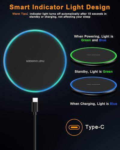【Meerdere veiligheidsfuncties】Onze inductieve oplader beschikt over een intelligente chip die oververhitting, overspanning, onderspanning en kortsluiting voorkomt. Met een Type-C-ingang biedt het additional bescherming tegen overspanning, kortsluiting, overstroom en oververhitting. De intelligente LED-indicator toont de oplaadstatus aan en schakelt zich automatisch na 15 seconden in standby- of oplaadmodus uit, zodat je slaap niet verstoord wordt.