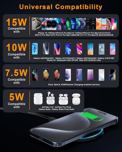 【Alomvattende compatibiliteit】Onze 15W draadloze oplader biedt indrukwekkende compatibiliteit. Het ondersteunt 15W voor iPhone sixteen/15/14/thirteen/12/eleven/SE/XR/XS/X/8 Plus, 10W voor Samsung Galaxy S24/S23/S22/S21/S20/Take note 20/Take note 10, 7,5W voor Google Pixel four/4XL/three en LG G7/6/6 Plus, en 5W voor alle andere compatibele apparaten zoals AirPods 2/Skilled. Of je nu welk mobiele apparaat hebt, het werkt met onze telefoonoplader.