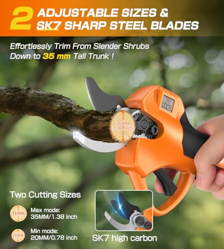 👍Sterk & precies snijden – 2 instelbare modi De elektrische snoeischaar gebruikt hoogwaardig SK7-messtaal voor ongeëvenaarde snijnauwkeurigheid. Twee instelbare snijdiameters: 20 mm en maximaal 35 mm, geschikt voor a lot of snoeiwensen. Meer controle en flexibiliteit voor het vormgeven van groen.