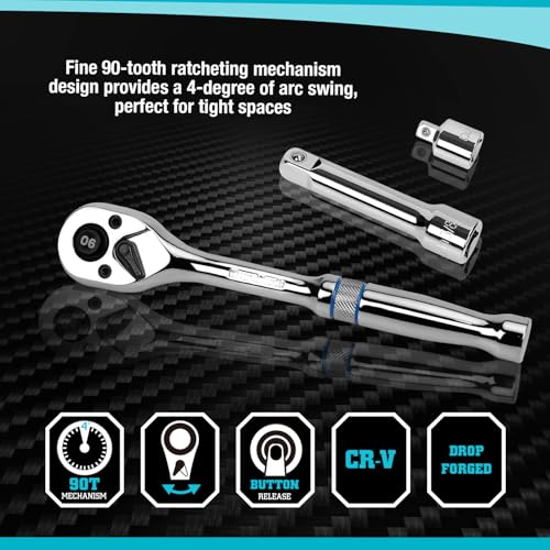 Professioneel – De stopcontacten hebben een off-nook laadontwerp om het afronden van bevestigingsmiddelen te verminderen. Een fijn ninety-tands ratelmechanisme ontwerp zorgt voor een boogschommel van 4 graden, just right voor krappe ruimtes. Stevige combinatiesleutels zijn voorzien van doosuiteinden met hetzelfde 120 Positie-systeem.