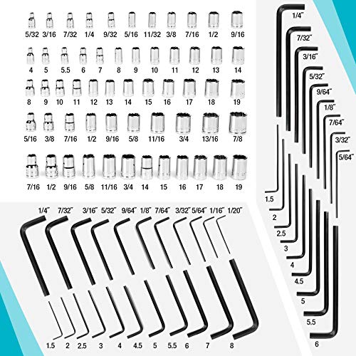 SAE/Metrisch – De set bevat een volledig assortiment metrische en SAE-sockets, sleutels, enz. En alle gereedschappen zijn gesneden met metrische/inch-maten. Of u nu werkt met standaard- of metrische metingen, deze stukken voldoen aan uw behoeften en ze zijn gemakkelijk te herkennen, zodat u het exacte gereedschap vindt dat u nodig hebt.