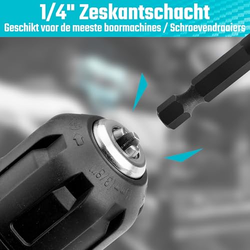 Krachtige accessoires: 3 dopsleuteladapters: 1/4“ (65 mm), 3/8” (65 mm), 1/2” (72 mm) – één uiteinde zeskant H1/4, het andere uiteinde vierkant. 2 verlengstukken: eendelig koppelstuk (60 mm) en gedeeld verlengstuk (150 mm). De booradapter en verlengstangen hebben een hardheid van HRC 40-54 en een koppelcapaciteit van meer dan 40 NM, waardoor betrouwbare prestaties gegarandeerd zijn