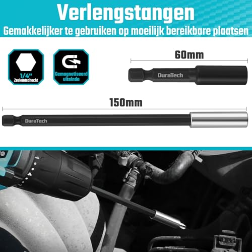 Uitgebreid toepassingsgebied: De adapter- en verlengstiftset bevat twee verlengstangen (60 mm en 150 mm), waardoor de gebruiker effectief kan werken in krappe ruimtes. De 1/4” zeskantschacht is compatibel met de meeste boren en schroevendraaiers en kan eenvoudig worden aangesloten op bestaand gereedschap
