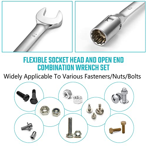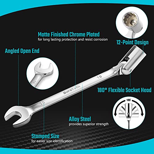 Combinatiesleutel: het 180 graden draaibare flexkopontwerp helpt je om moeren of bevestigingsmiddelen in krappe ruimte gemakkelijk te bereiken en te bedienen, waardoor je werk moeiteloos wordt.