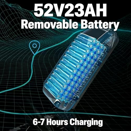 【52V 23Ah accu】Deze e-bike is uitgerust met een 52V 23Ah poweraccu om een lange rit te garanderen, hij heeft een bereik van maximaal 30 mijl (enkele motor) en 25 mijl (dubbele motor) in gasmodus, en met behulp van de pedaalondersteuningsfunctie kan het bereik worden uitgebreid tot een indrukwekkende 70 mijl (enkele motor) en 45 mijl (45 mijl (45 mijl (enkele motor) dual-motor), ervoor zorgen dat je kunt gemakkelijk langere ritten overwinnen.