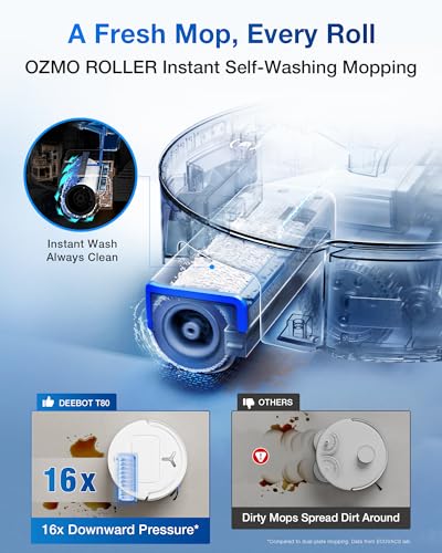 De ECOVACS DEEBOT T80 OMNI robotstofzuiger combineert 18.000 Pa zuigkracht met een zelfreinigende OZMO ROLLER-dweil en hete water functie voor grondige reiniging. De dynamische dweil en ZeroTangle 3.0 zorgen voor effectieve vlekverwijdering en haarvrije prestaties, ook bij randen en hoeken.