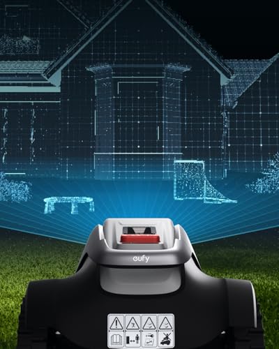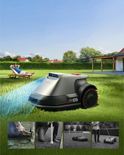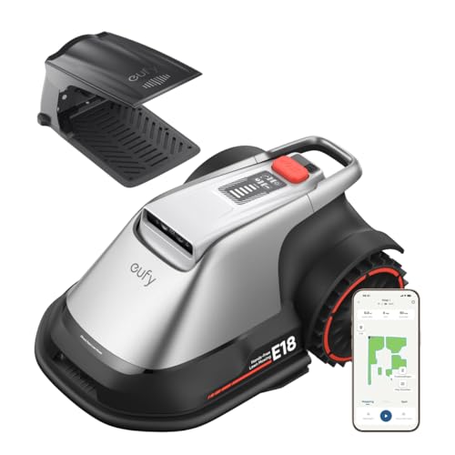 eufy E18 Robotic Lawn Mower, No Boundary Wire/RTK/Signal Loss. TrueVision + GNSS for lawns up to 1200 m². Precise edge mowing, avoiding obstacles, app control.