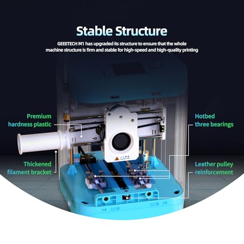 In vergelijking met vergelijkbare producten heeft de GEEETECH M1 Mini 3D-printer zijn structuur verbeterd om ervoor te zorgen dat de hele structuur van de machine stevig en stabiel is, wat een fundamentele garantie biedt voor hogesnelheidsprinten en hoge kwaliteit. Leerriemschijvenversterking, hotbed met drie lagers, dikke filamenthouder, kunststof met hogere hardheid. 2,4 inch LCD-kleurenscherm: groter weergaveformaat, handiger bediening; PEI-printplaat: de PEI-printplaat maakt het mogelijk om het model gemakkelijk te verwijderen; verlichting met hoge helderheid: drie LED’s met hoge helderheid zijn aan de binnenkant van het lichaam aangebracht.