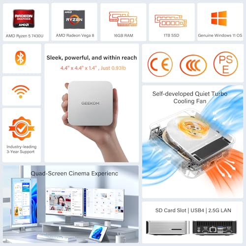 GEEKOM Mini PC A5 Pro met AMD Ryzen 5 7430U, 16 GB uitbreidbaar DDR4 RAM (geen vast LPDDR) + 512 GB SSD | Compacte mini-desktop-pc W-11 Pro | 6 x USB | Quad-display, voor zakelijk gebruik