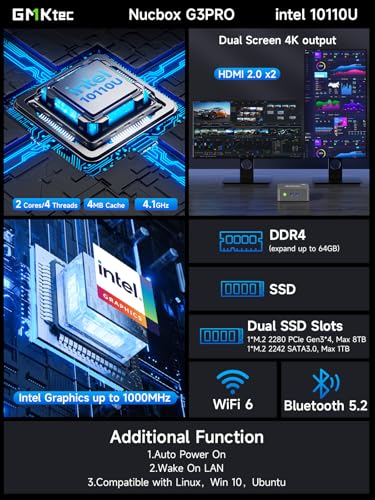 Specificaties: GMKtec Mini PC, G3 PRO Intel Core i3-10110U (Beats 4300U/N150), 16GB DDR4 RAM (Dual Channel) 512GB PCIe M.2 SSD, Desktop Computer 4K Dual HDMI/USB3.2/WiFi 6/BT5.2/2.5GbE for Office, Business