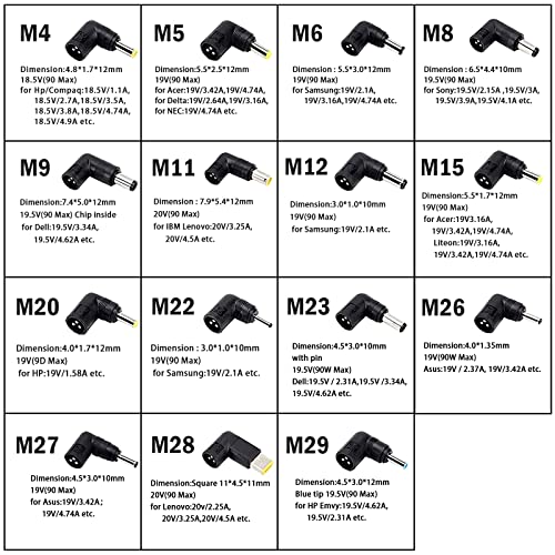 Productspecificatie: 1. Ingang: AC 100 ~ 240 V ~ 2 A 50 ~ 60 Hz. 2de Uitgave: 18,5 V = 4,9 V, 19 V = 4,74 A, 19,5 V = 4,62 A, 20 V = 4,5 A. 3de Afmetingen: 145 × 70 × 28 mm (l × b × h). Controleer de prestatiegegevens en de stekkergrootte van je laptop. EN Voordat je de laptop oplaadt, stel je deze adapter eerst in op de juiste spanning. Als je niet zeker weet of je laptop de juiste maat heeft, stuur ons dan voor de aankoop