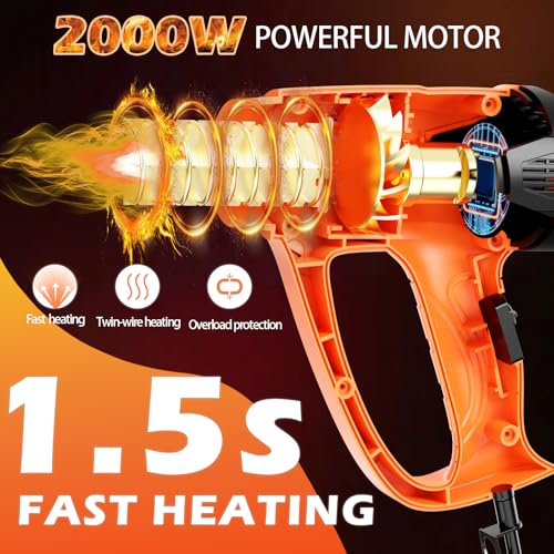 Krachtig en goed ontworpen: uitgerust met een 2000 W zuivere koperen motor en een hogesnelheidsturbine bereikt deze heteluchtblazer de werktemperatuur in slechts 1,5 seconde. Het spiraalmondstuk zorgt voor een gelijkmatige warmteverdeling en een betere temperatuurregeling. De hittebestendige PP-mondstukbehuizing beschermt effectief tegen brandwonden voor maximale veiligheid.