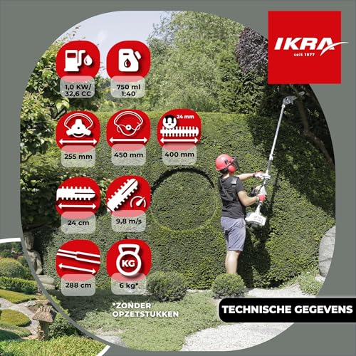 Specificaties: IKRA Benzine multifunctioneel tuingereedschap Multitool IBKH 33-1, 4in1: bosmaaier, gazontrimmer, heggenschaar, hoogsnoeier