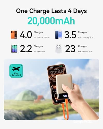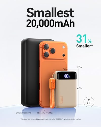 De kleinste powerbank van 20.000 mAh, slechts 1,94 inch diagonaal, maar sterk genoeg om je iPhone 17 vier keer en Galaxy S24 drie keer op te weighted down.