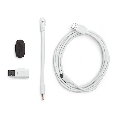 Meegeleverd: JBL Quantum 360PS gamingheadset met afneembare microfoon in wit, USB-C naar USB-A converter, USB audio adapter, windschermschuim voor boommicrofoon, veiligheidsblad en QSG
